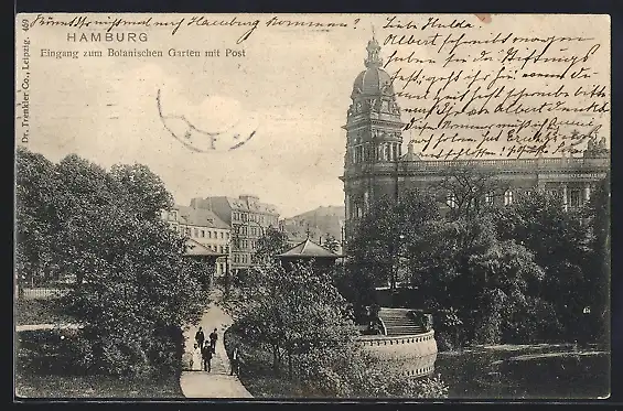 AK Hamburg-St.Pauli, Eingang zum Botanischen Garten mit Post