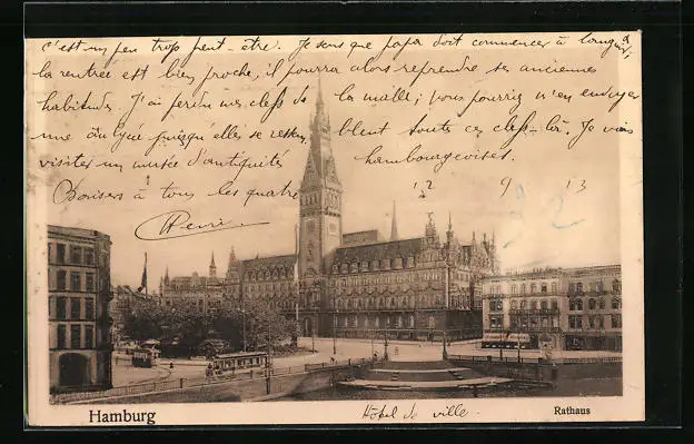 AK Hamburg, Strassenbahnen vor dem Rathaus