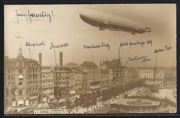 AK Hamburg, Zeppelin Hansa über der Stadt