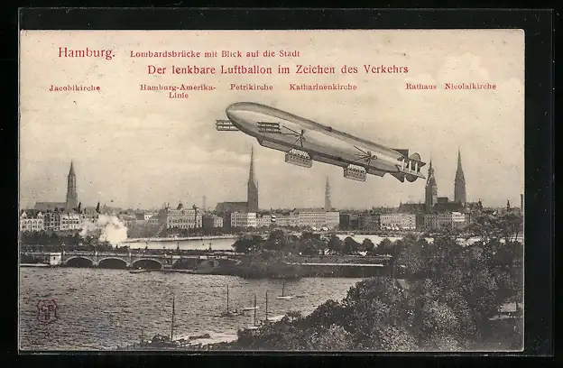 AK Hamburg, Zeppelin über der Lombardsbrücke mit Blick auf die Stadt mit Jacobikirche u. Rathaus