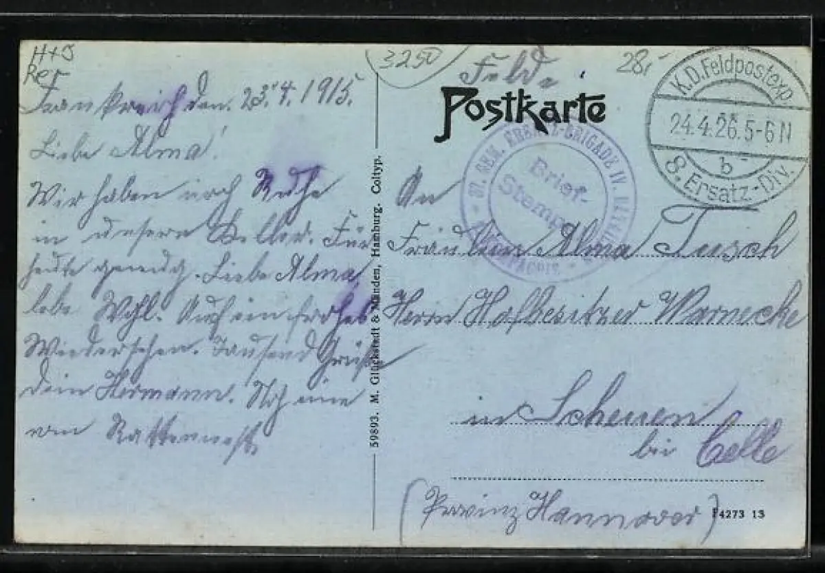 Personenbezogene Daten auf der Rückseite der Karte wurden durch blauen Textmarker unkenntlich gemacht. Die blauen Stellen sind auf die Vorderseite durchgeweicht und wirken sich negativ auf das Postkartenfoto aus