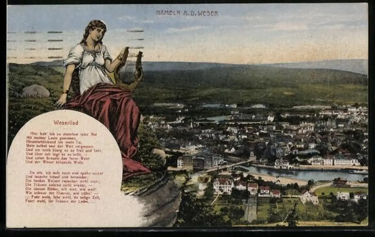 AK Hameln a. d. Weser, Stadtansicht aus der Vogelschau, Weserlied