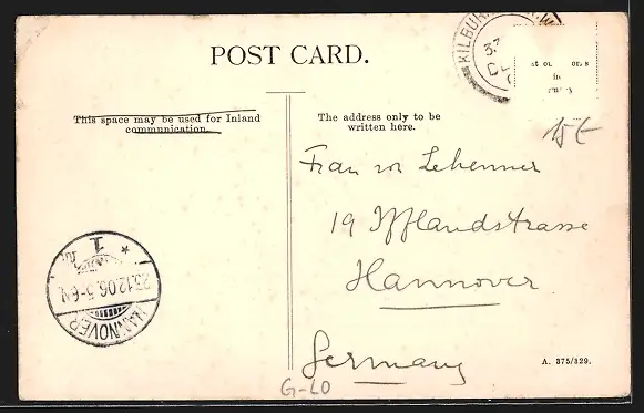 alte Ansichtskarte, gelaufen 1906, Briefmarke entfernt, rückseitig Oberflächenschaden, Eckknick re. oben, guter Zustand
