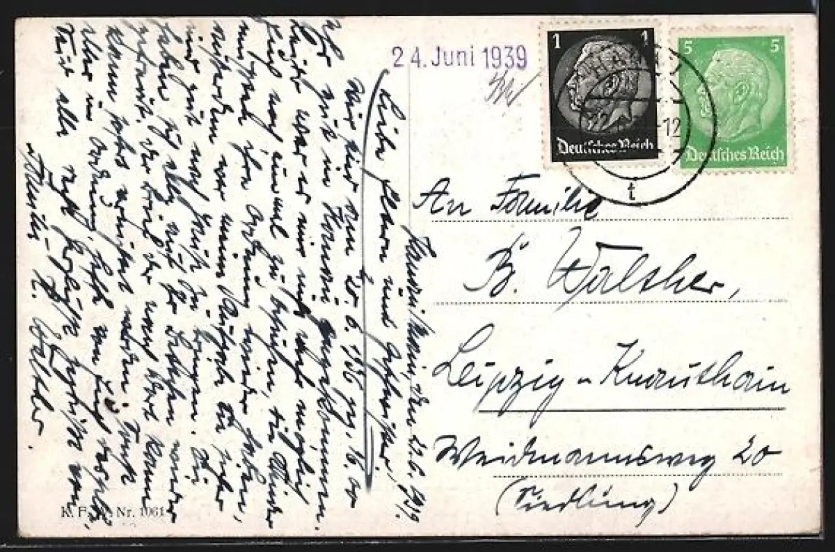 gelaufen 1939, Eckknick oben rechts, guter Zustand
