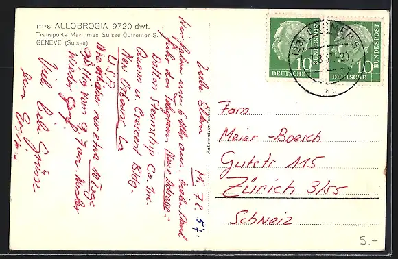 AK Handelsschiff Allobrogia in Fahrt, Transports Maritimes Suisse-Outremer