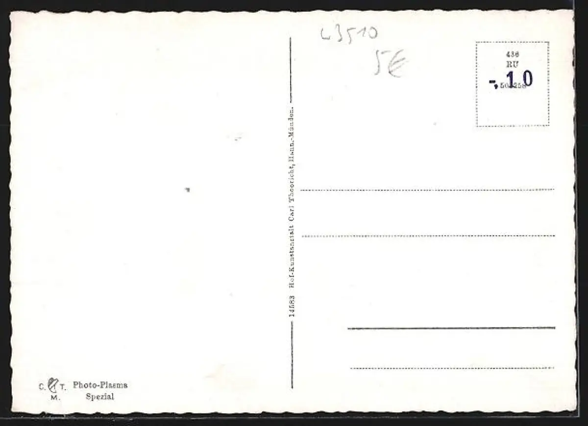 Personenbezogene Daten auf der Rückseite der Karte wurden durch blauen Textmarker unkenntlich gemacht. Die blauen Stellen sind auf die Vorderseite durchgeweicht und wirken sich negativ auf das Postkartenfoto aus