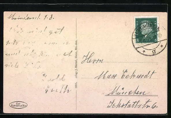 alte Ansichtskarte, gelaufen 1929, rückseitig Oberflächenschaden, Bugspuren li. oben u. unten, guter Zustand