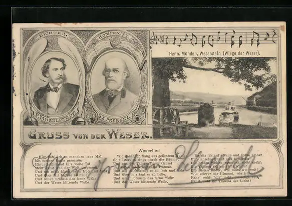 AK Hann.-Münden, Weserstein mit Dampfer, Dichter F. Dingelstedt, Komponist G. A. Pressel
