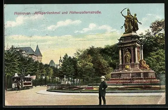 AK Hannover, Strassenbahn mit Kriegerdenkmal in der Hohenzollernstrasse