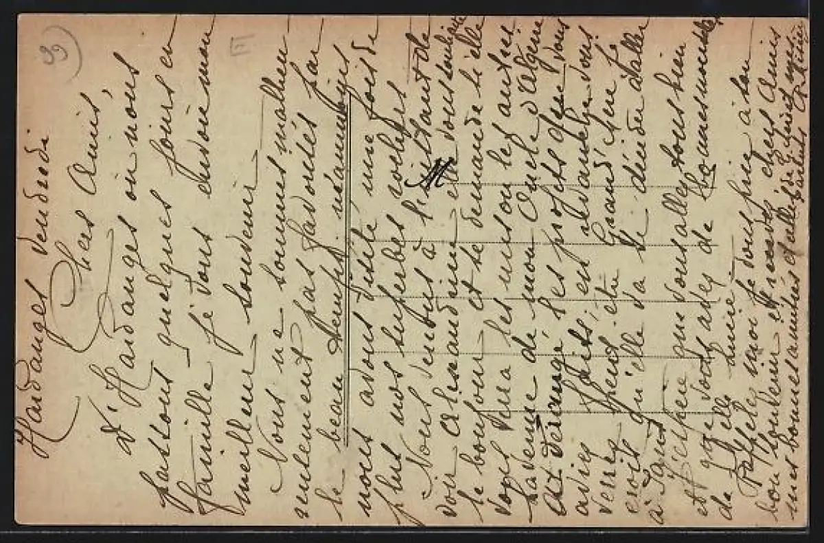 Personenbezogene Daten auf der Rückseite der Karte wurden durch blauen Textmarker unkenntlich gemacht. Die blauen Stellen sind auf die Vorderseite durchgeweicht und wirken sich negativ auf das Postkartenfoto aus