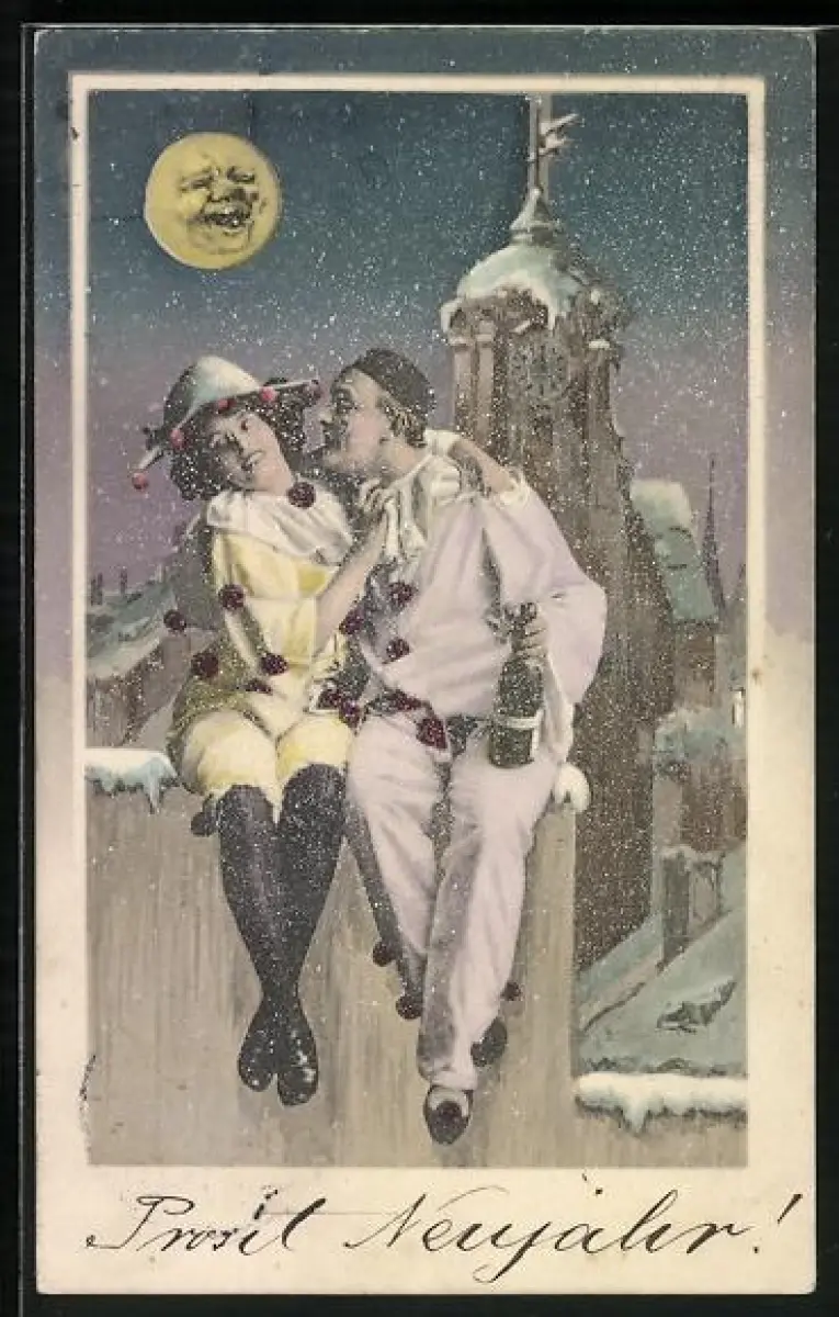 AK Harlekinpaar auf einer hohen Mauer, Turmuhr, Mond mit Gesicht, Neujahrsgruss
