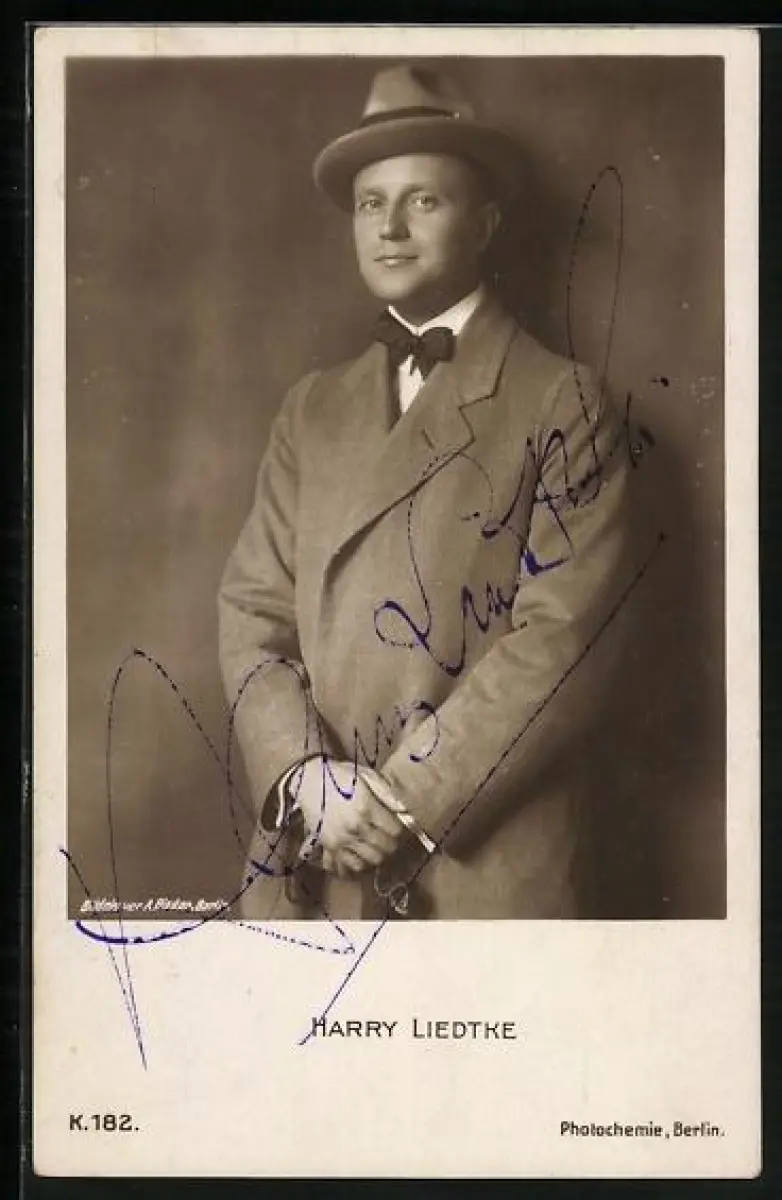 AK Harry Liedke in Hut und Mantel, Autograph