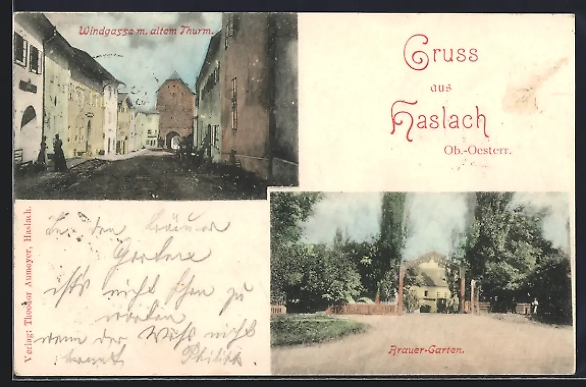 AK Haslach /Ob.-Oesterr., Windgasse m. altem Thurm, Brauer-Garten