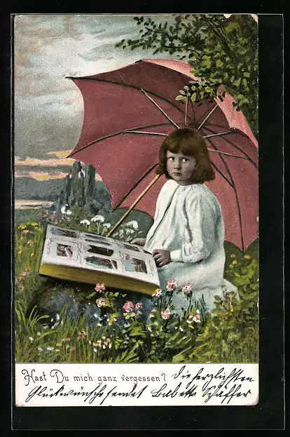 AK Hast Du mich vergessen?, Mädchen sitzt mit einen Ansichtskartenalbum unter einem Schirm