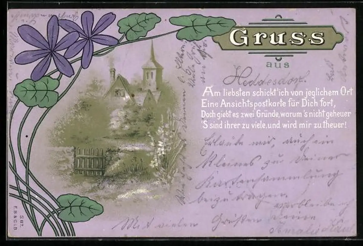 AK Haus in der Idylle, Veilchen als Rahmen, Jugendstil um 1900