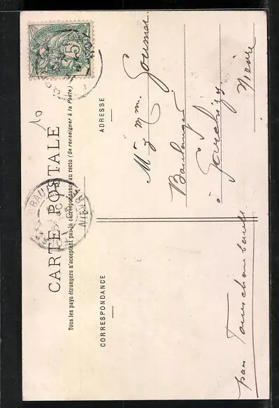 Personenbezogene Daten auf der Rückseite der Karte wurden durch blauen Textmarker unkenntlich gemacht. Die blauen Stellen sind auf die Vorderseite durchgeweicht und wirken sich negativ auf das Postkartenfoto aus