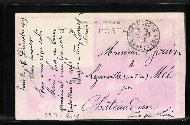 Personenbezogene Daten auf der Rückseite der Karte wurden durch blauen Textmarker unkenntlich gemacht. Die blauen Stellen sind auf die Vorderseite durchgeweicht und wirken sich negativ auf das Postkartenfoto aus