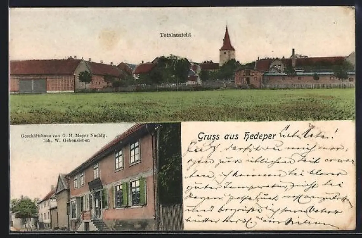 AK Hedeper, Geschäftshaus von G. H. Mayer Nachfg., Inh. W. Gebensleben, Totalansicht des Ortes