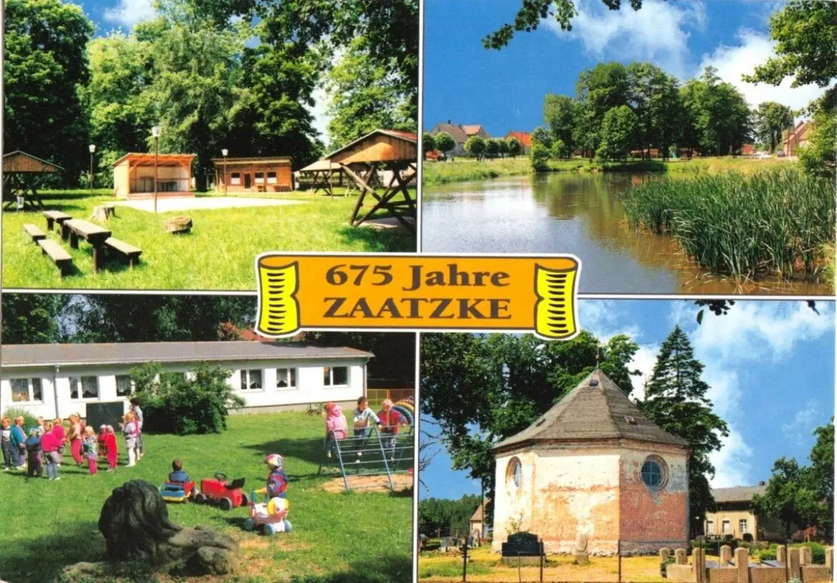 Ansichtskarte Heiligengrabe OT Zaatzke 675 Jahre Zaatzke vier Abb. - Insel mit Festplatz, Blick über den Dorfteich, Kindertagesstätte, Kirche im OT Glienicke Erhaltung I-II ungelaufen, um 1994 Verlag: Foto-Studio Mantey, Wittstock