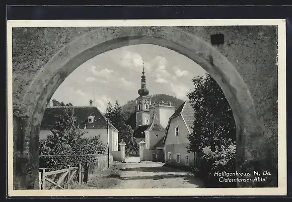 AK Heiligenkreuz /N. Do., Cistercienser-Abtei, durch ein Tor gesehen