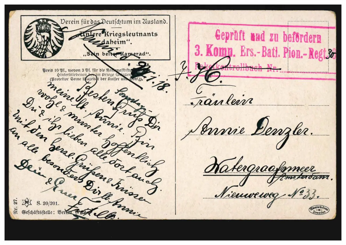 Ansichtskarte Verein für das Deutschtum im Ausland: Unsere Kriegsleutnants daheim / Sein bester Kamerad, roter Rahmenstempel "Geprüft und zu befördern - 3. Kompanie Ersatz-Bataillion Pionier Regiment (30?) - Paketkontrollbuch Nummer ...."