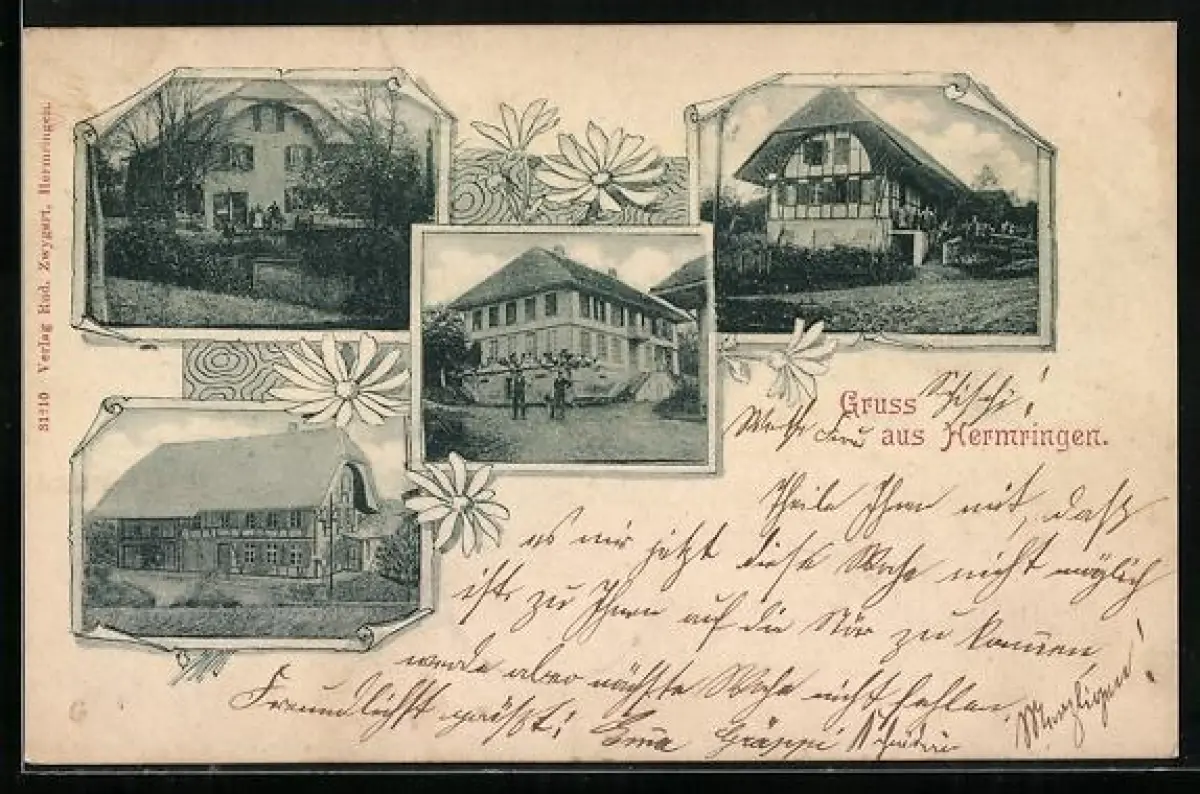 AK Hermrigen, 4 Gebäudeansichten, Passepartout mit Blumen
