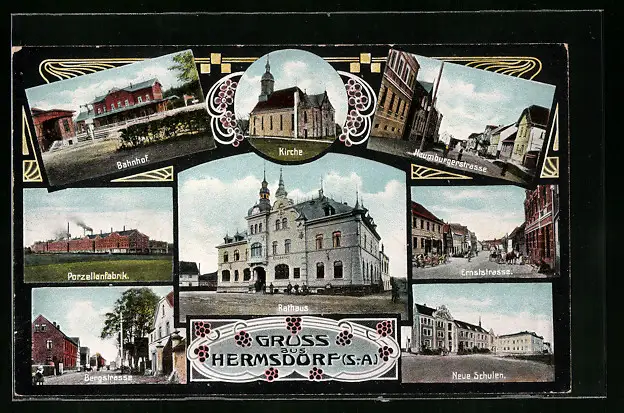 AK Hermsdorf /S. A., Bahnhof, Kirche, Naumburgerstrasse, Ernststrasse, Neue Schulen, Porzellanfabrik