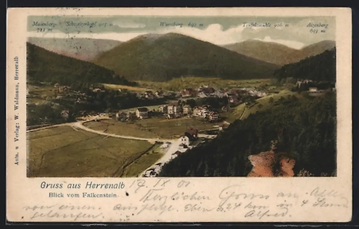 AK Herrenalb, Blick vom Falkenstein auf den Ort mit Wurstberg, Teufelsmühle und Maienberg
