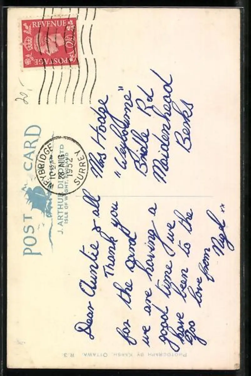 Personenbezogene Daten auf der Rückseite der Karte wurden durch blauen Textmarker unkenntlich gemacht. Die blauen Stellen sind auf die Vorderseite durchgeweicht und wirken sich negativ auf das Postkartenfoto aus