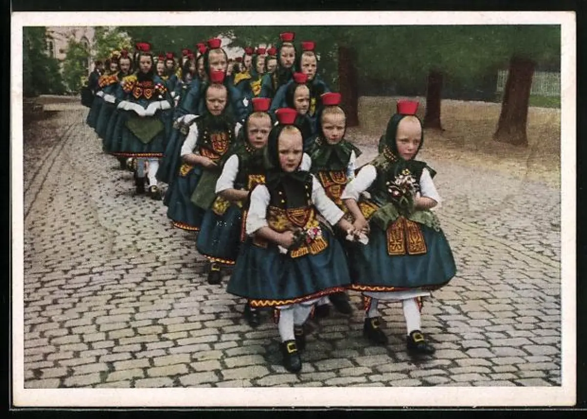 AK Hessische Trachten, Schwälmer Kinder im Festschuck auf der Kirmes