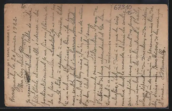 Personenbezogene Daten auf der Rückseite der Karte wurden durch blauen Textmarker unkenntlich gemacht. Die blauen Stellen sind auf die Vorderseite durchgeweicht und wirken sich negativ auf das Postkartenfoto aus
