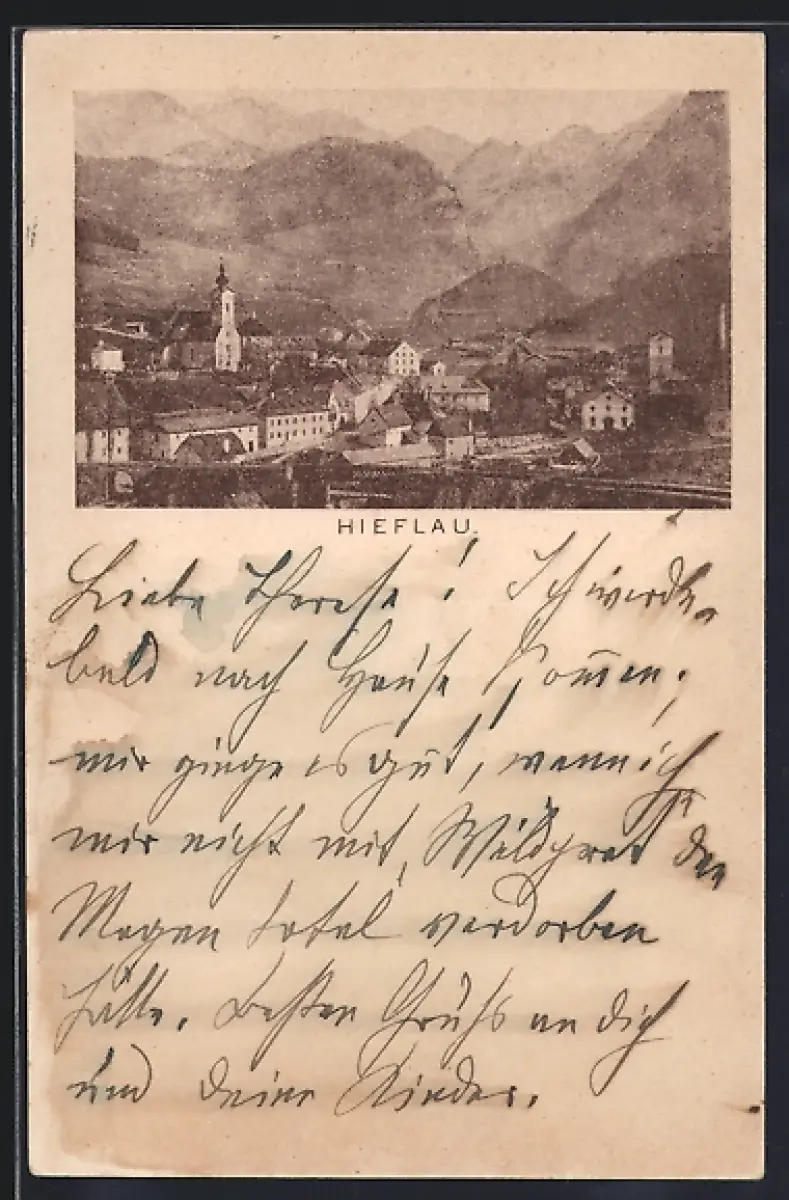 AK Hieflau, Ortsansicht mit Berglandschaft