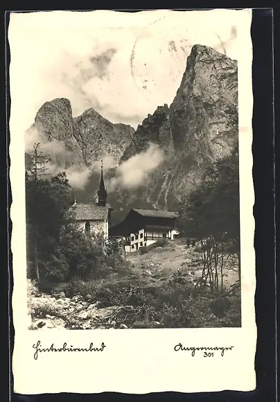 AK Hinterbärenbad, Ortsansicht mit Kirche vor Felswand