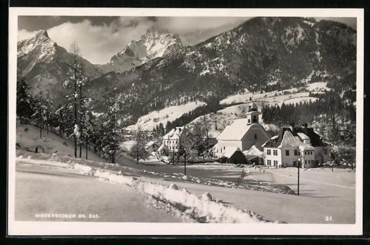 AK Hinterstoder /O.-Ö., Ortsansicht im Schnee vor Bergpanorama