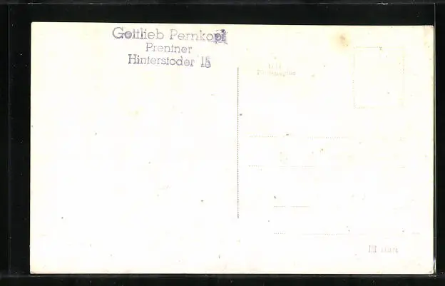 Personenbezogene Daten auf der Rückseite der Karte wurden durch blauen Textmarker unkenntlich gemacht. Die blauen Stellen sind auf die Vorderseite durchgeweicht und wirken sich negativ auf das Postkartenfoto aus