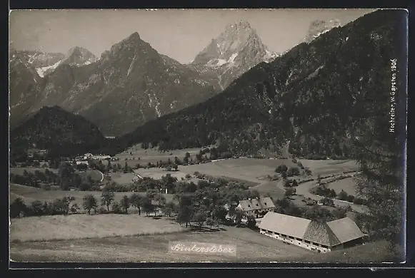 AK Hinterstoder, vereinzelte Häuser gegen Bergpanorama