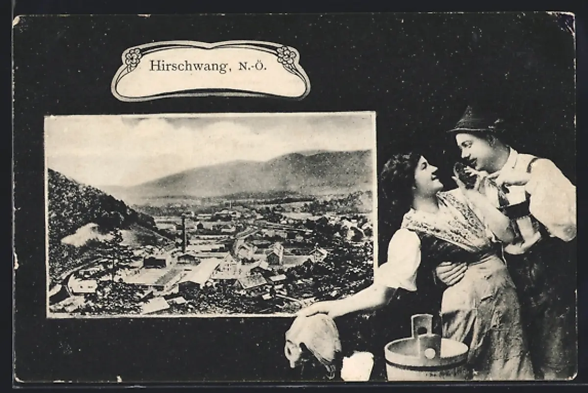 AK Hirschwang /N.-Ö., Totalansicht mit Fabrik, Trachtenpaar am Waschzuber