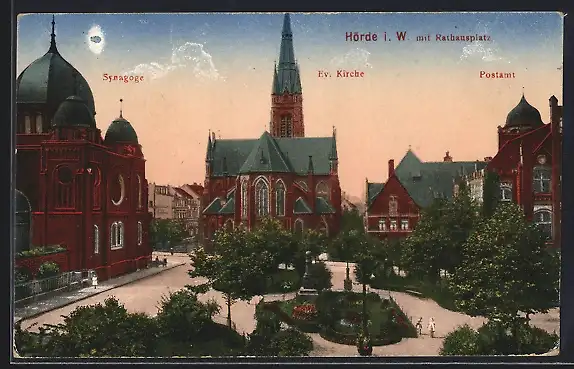 AK Hörde i. W., Synagoge, Ev. Kirche und Postamt