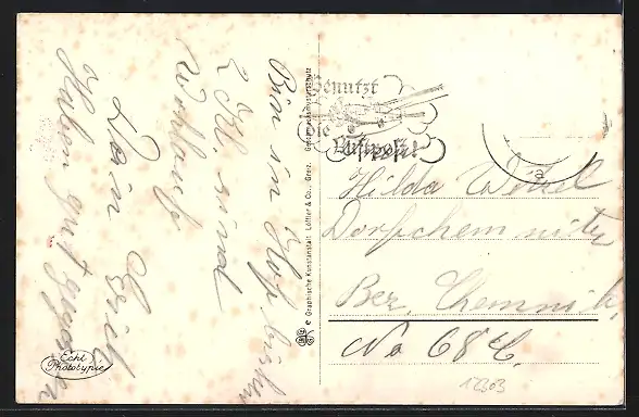 alte Ansichtskarte, gelaufen, Briefmarke entfernt, rückseitig Oberflächenschaden, guter Zustand