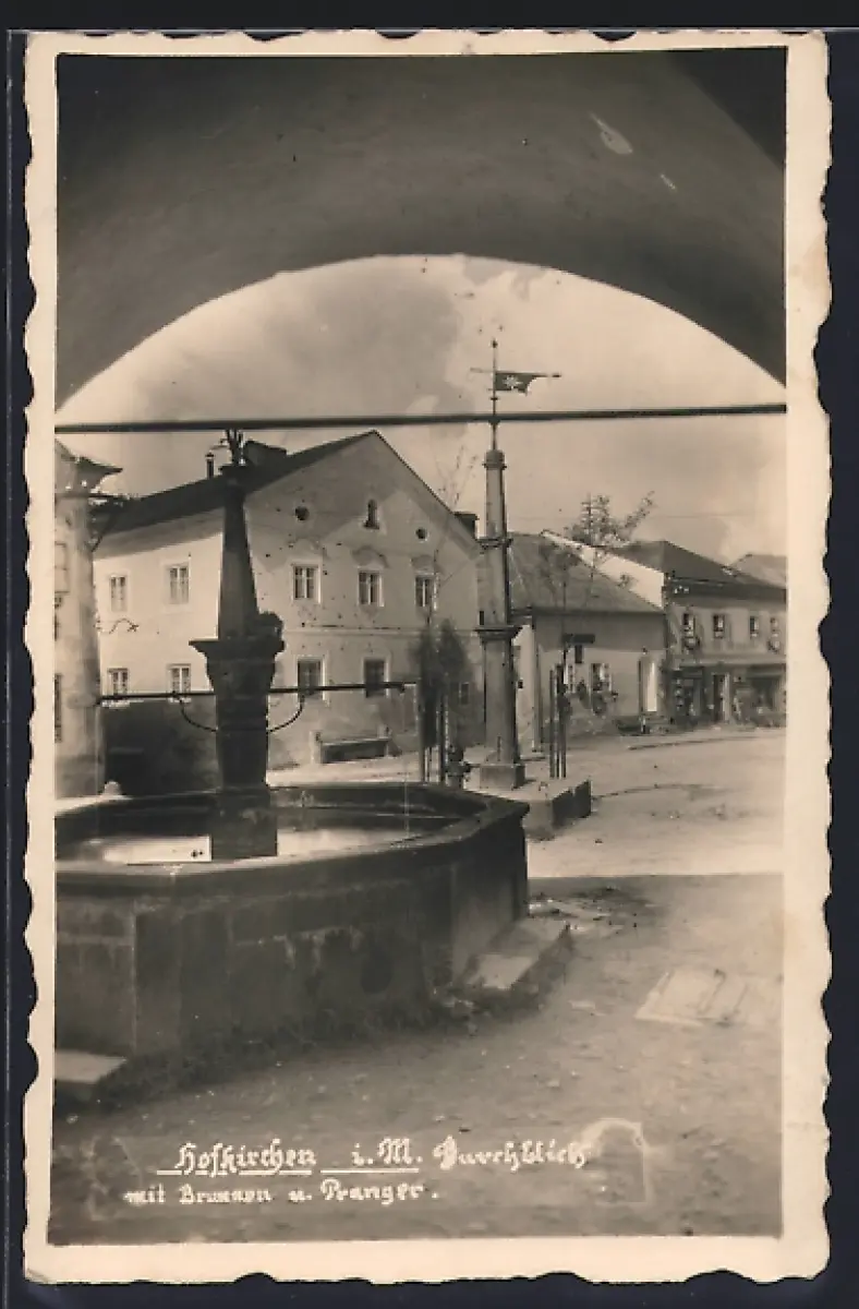 AK Hofkirchen i. M., Durchblick durch ein Tor mit Brunnen u. Pranger, Geschäftshaus