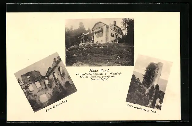 AK Hohe Wand, Herrgottschnitzerhütte am Wandeck, Ruine und Feste Starhemberg