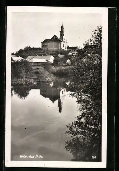AK Hoheneich, Ortspartie mit Blick zur Kirche am See