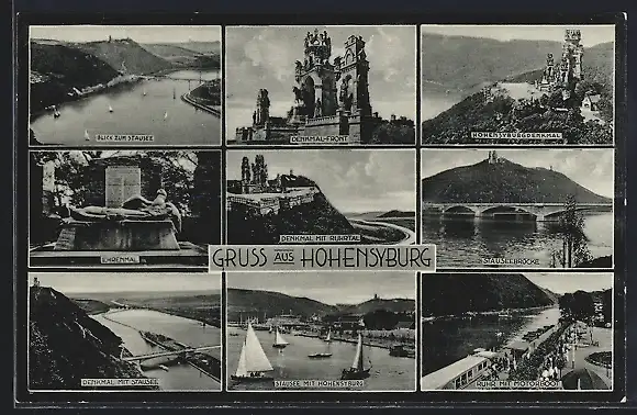 AK Hohensyburg, Denkmal m. Ruhrtal, Blick z. Stausee, Ruhr m. Motorboot, Stauseebrücke, Hohensyburgdenkmal u. a.