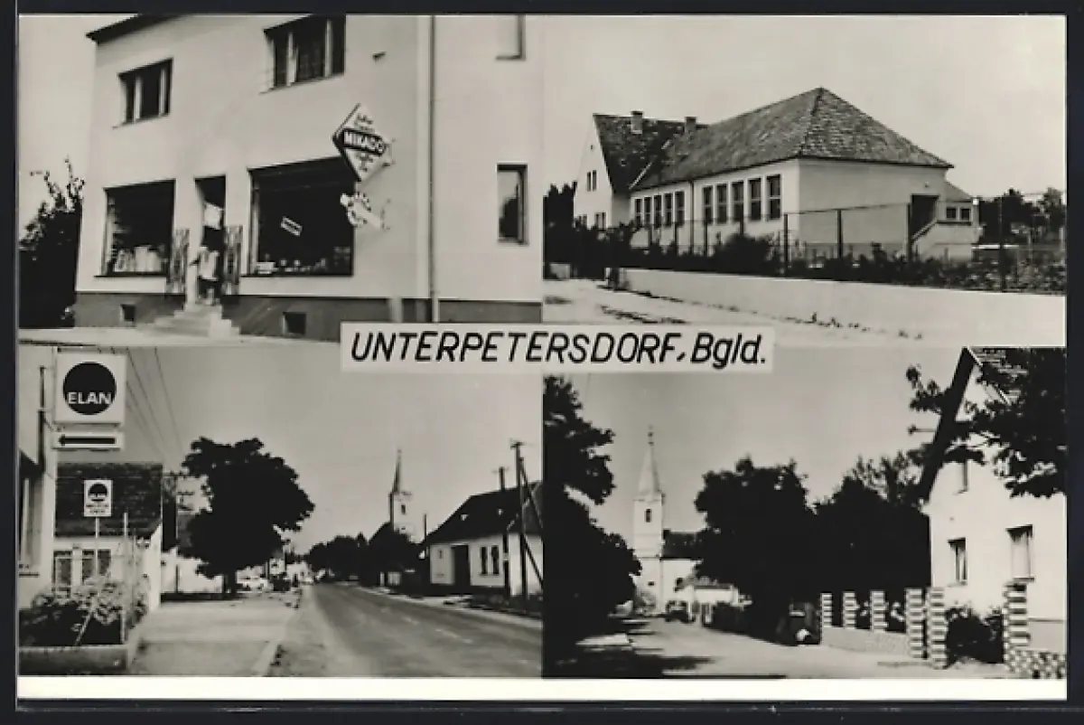 AK Horitschon, Unterpetersdorf, Kaufhaus Binder, Strassenpartie mit Kirche u. Elan-Geschäftsschild