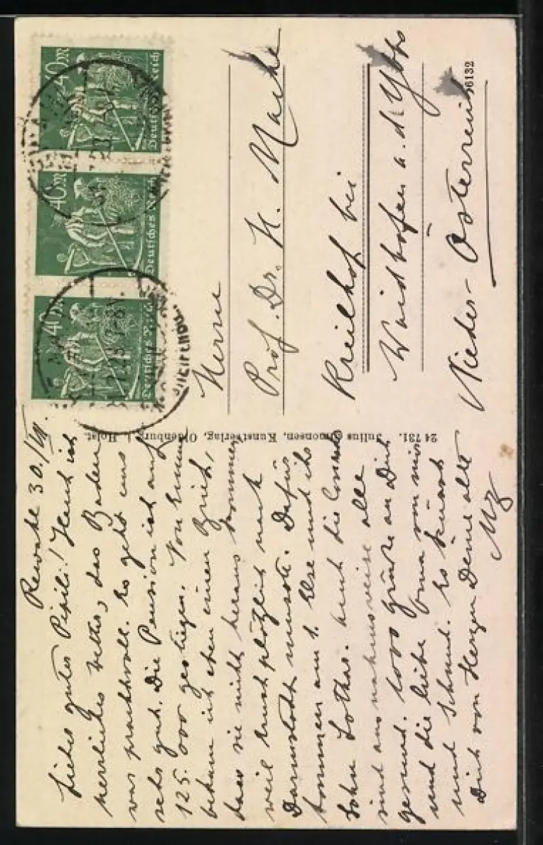 Personenbezogene Daten auf der Rückseite der Karte wurden durch blauen Textmarker unkenntlich gemacht. Die blauen Stellen sind auf die Vorderseite durchgeweicht und wirken sich negativ auf das Postkartenfoto aus