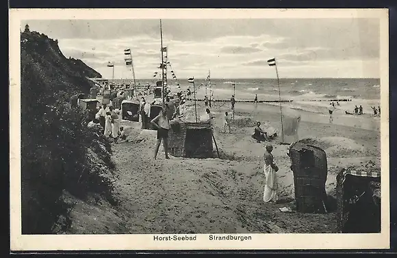 AK Horst-Seebad, Strandburgen, Strandpartie mit Seeblick