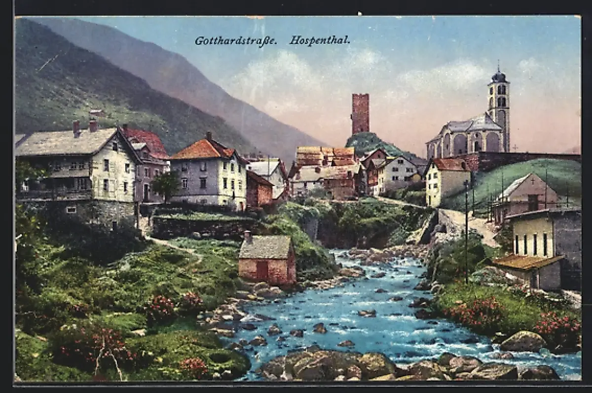AK Hospenthal, Gotthardstrasse, Ortspartie mit Kirche