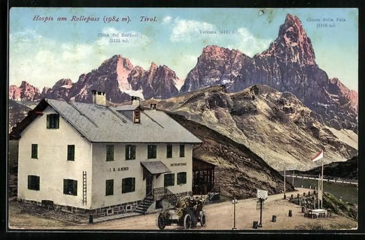 AK Hospiz am Rollepass, Ansicht gegen Cima dei Burdoni, Vezzana und Cimon della Pala