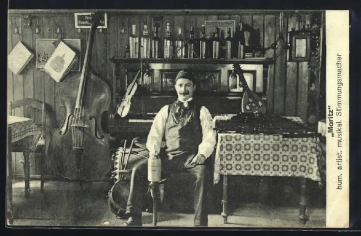 AK Humorist Moritz, Portrait mit Musikinstrumenten