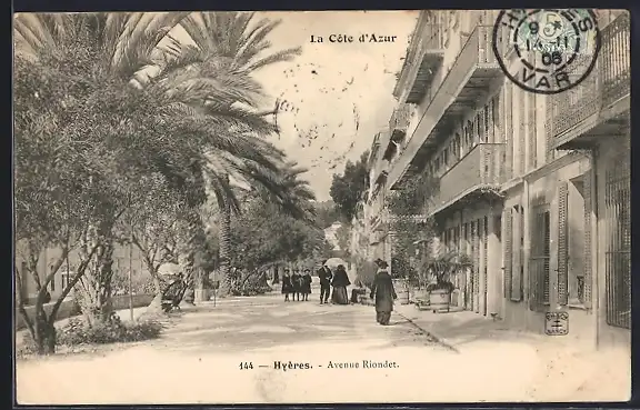 AK Hyères, Avenue Riondet sur la Côte d`Azur avec palmiers et passants élégants